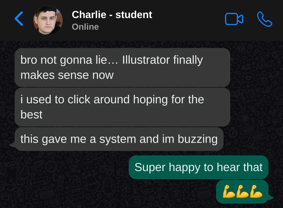 This course was built for beginners and overwhelmed intermediates who feel lost in Illustrator. We start with the foundations that make the software finally make sense, then build skill day by day. If tutorials never worked for you, this is the opposite of that.